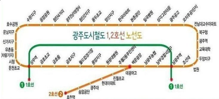 광주 지하철 2호선 노선도 : 호천역 - 송암공단역 - 광주대역 - 현대아파트 - 진월 초등학교 - 대광여고 - 백운광장역 - 남광주농협 - 남부경찰서입구 - 남광주역 - 조선대 - 법원 - 두암지구 - 교육대학 - 광주역 - 북구청 - 전남대교수아파트 - 오치주공1단지 - 광주공고역 - 감각 그린타운 - 일곡병원역 - 본촌공단 - 한국아파트 - 양산지구 - 용두초등학교 - 첨단2지구 - 광주 전남지방청사 - 첨단4거리 - 용암공원 - 수완지구 - 호수공원 - 문남지구 - 신가지구 - 유촌동 - 시청 - 운천초등학교 - 상무역 -금호초등학교 - 금호중학교 -금호지구 - 월드컵경기장 - 풍암지구 - 원광대병원 - 주월2동 주민센터