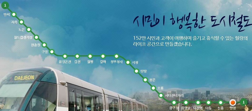 대전 지하철 노선도 : 반석역 - 지족역 - 노은역 - 대전 월드컵경기장 - 현충원 - 구암역 - 유성온천역 - 갑천역 - 월평역 - 갈마역 - 정부청사역 - 대전 시청 - 탄방역 - 용문역 - 오룡역 - 서대전 네거리 - 대전 중구청 - 중앙로 - 대전 - 대동 - 신흥 - 판암